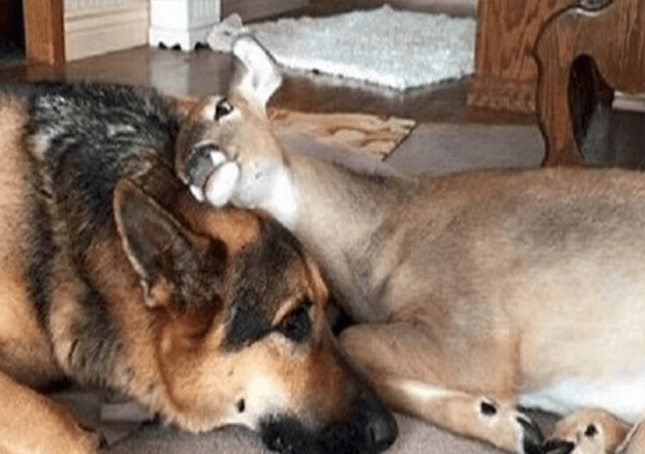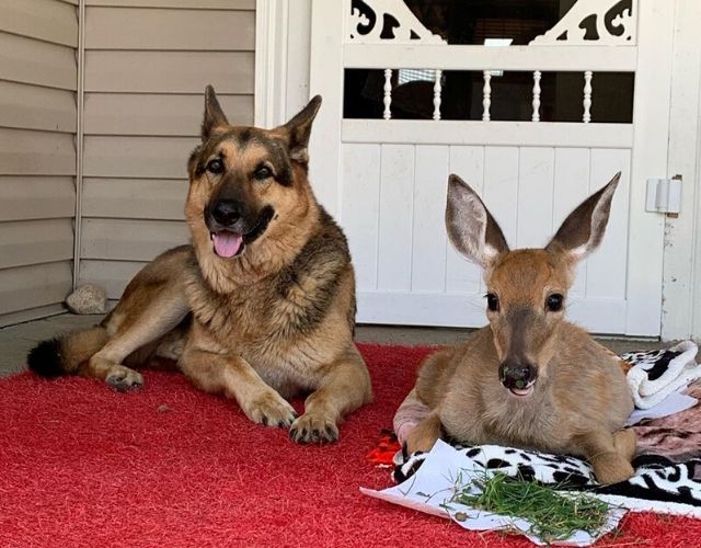 Cheryl and Sarge’s first orphaned fawn was a sweet baby named Buckwheat that was found lying alone in the road. From the moment Cheryl introduced Sarge to his new foster fawn, it was as if he knew this was his life’s purpose!
