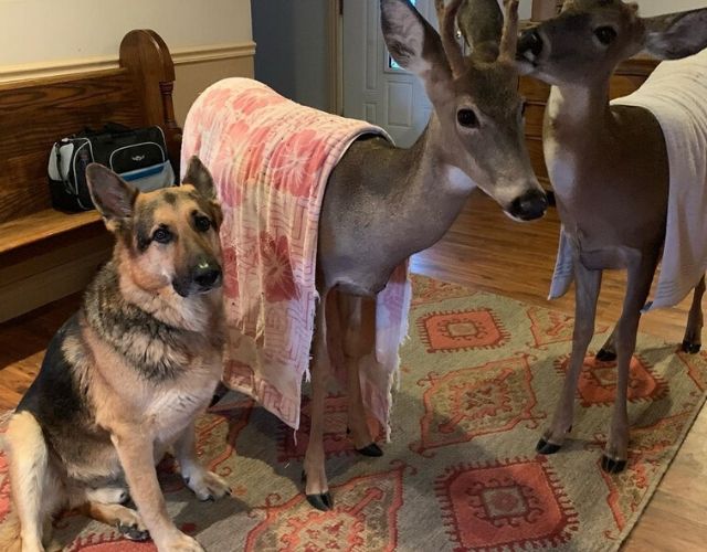 “When I walk in the door carrying a fawn, Sarge springs into action. He wants to check them over and he will frantically sniff and nose around to determine their condition. The fawns are drawn to Sarge and feel safe in his presence. Sarge won’t leave their side.” – Cheryl