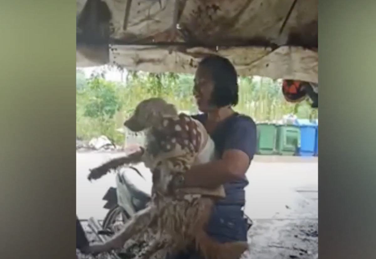 But even though Lamyai came out of hiding, she continued to run away. It was raining out and a dog in her condition likely couldn’t regulate her body temperature. But the rescuers didn’t give up. The main rescuer chased Lamyai in circles around makeshift structures. Finally, after over an hour, the rescuer was able to pick Lamyai up and wrap a blanket around her.