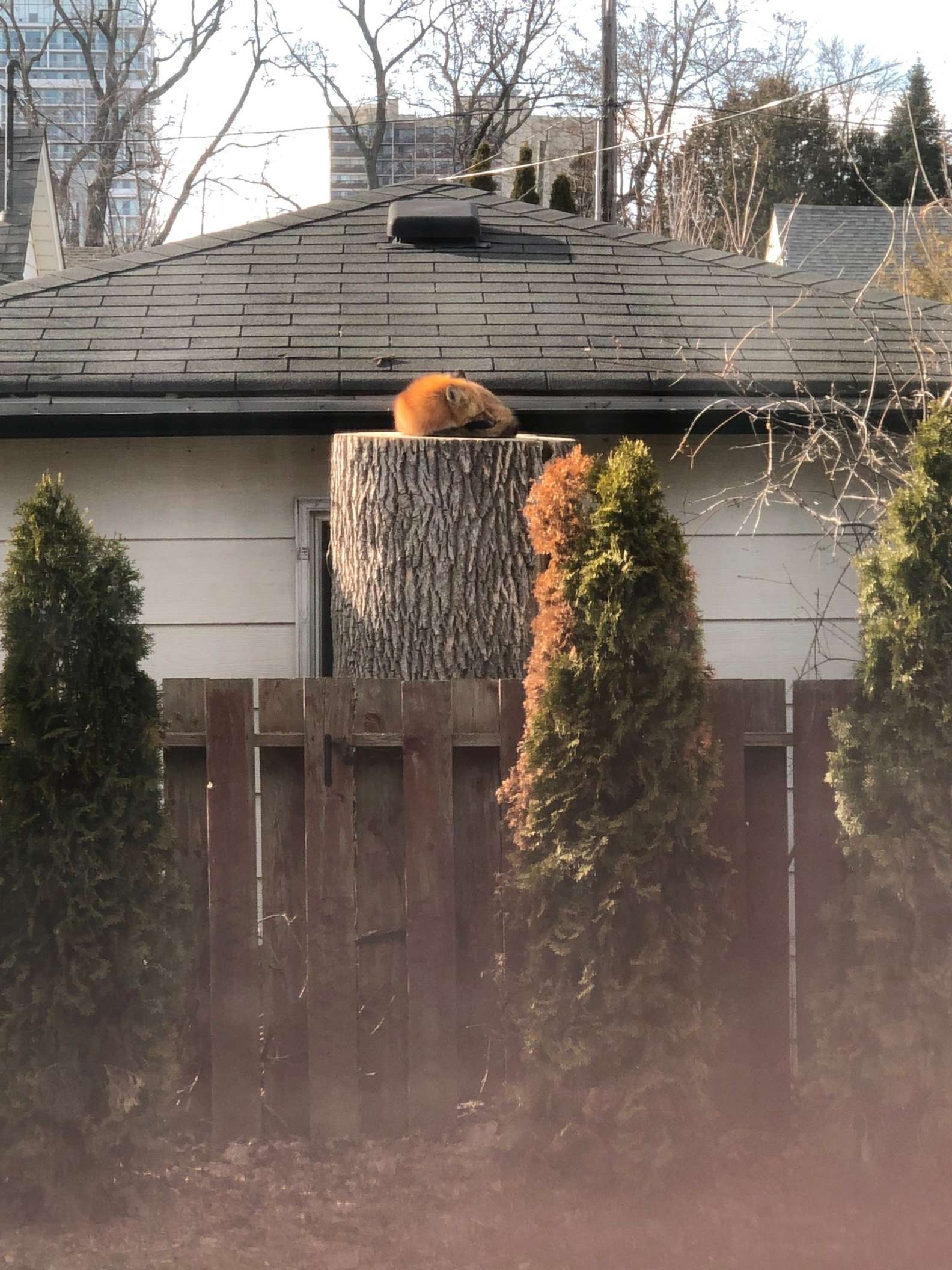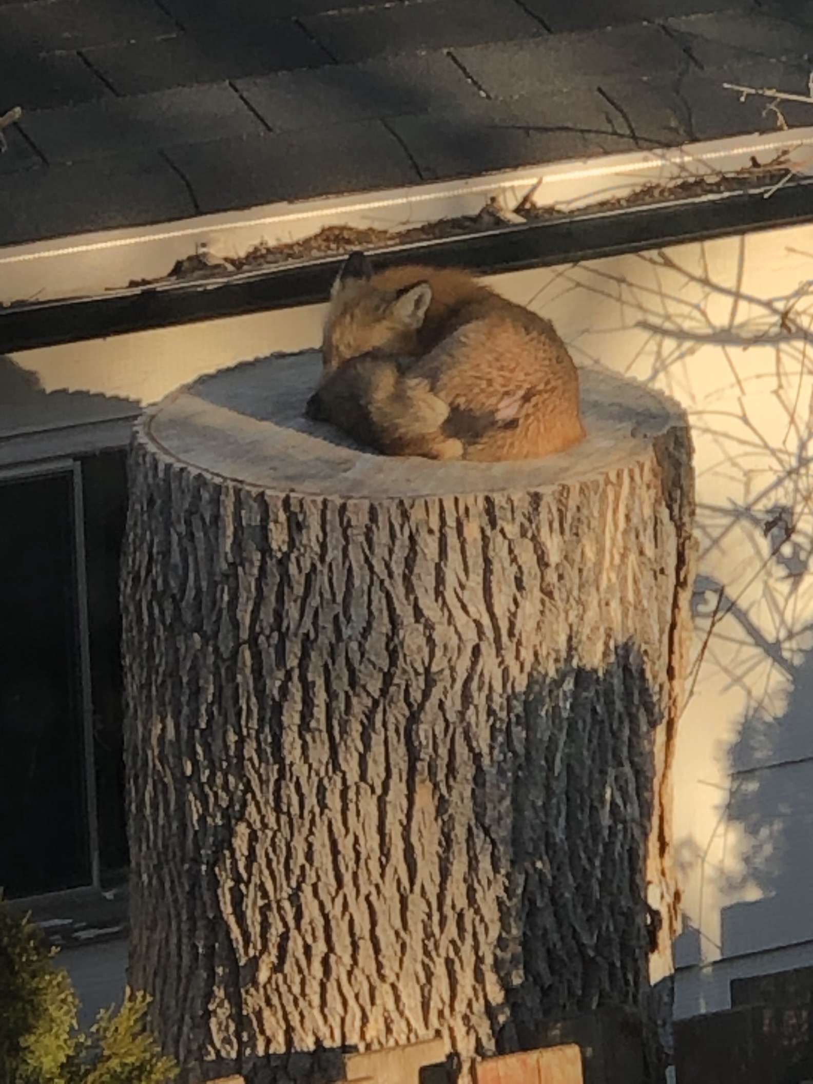 Ryan’s dad first spotted the fox on Tuesday, there on the remnants of a dead tree the city had removed last year. Since then, he’s been sending her regular updates.