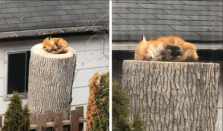 Clearly, the cozy little fox felt secure in his slumber, perched atop the tall stump.