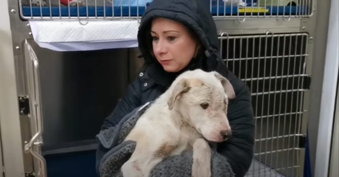 When Ermione arrived from DAR Animal Rescue, she took a blanket and wrapped the dog up to keep him warm. She also used the blanket so she could carry the dog to her car. The dog was in such bad shape that they named him Casper because he was white and frail.