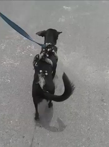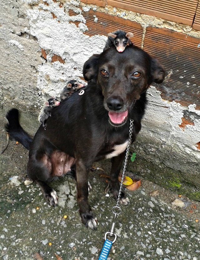 The dog is so accepting of letting the opossum orphans climb on her that she even takes them on rides during her walks, just like a real opossum mother.