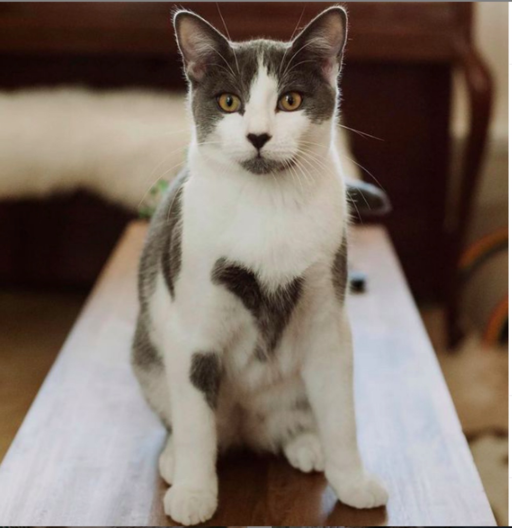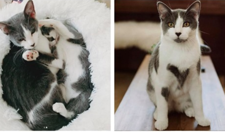 River and Remi were being fostered with Wrenn Rescues, a small California cat rescue. When Duda went to pick them up she noticed River had a huge heart in the middle of his chest.