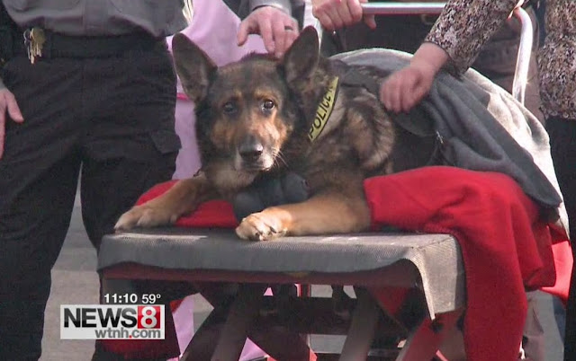 Zeus, a German Shepherd who had worked with the department for nine years, was given the same emotional send-off as any human cop. It would be his last journey in a police car. A police car parade followed Zeus’ automobile to the Ridgefield Veterinary Hospital, where he was wheeled through a gathering of servicemen.