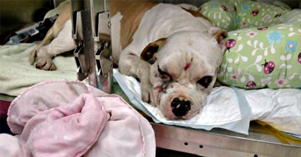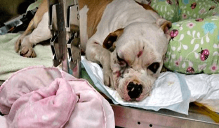 Close to death, Bear was taken to the local animal hospital where Katie’s mother happened to work. His owner was contacted, but when they showed up to identify him and saw the extent of his injuries, they left him there. He sat in the cage, in agony, for three days. Bear’s eyes were so badly injured that they eventually had to be removed.