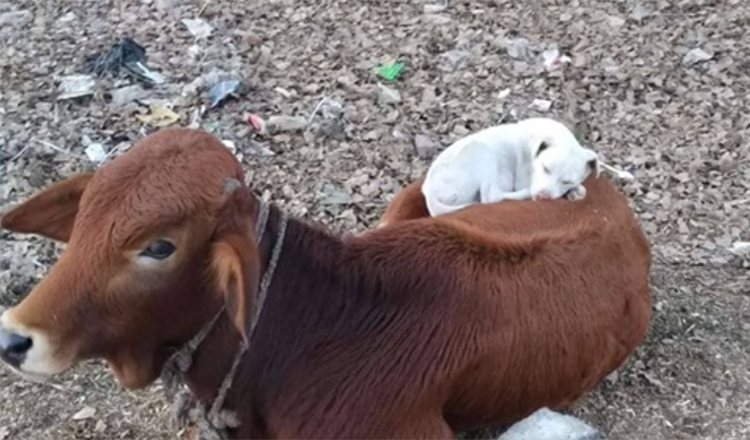 Gambhir was leaving his house when spotted a cow curling up next to a local snack stall. This sight seemed normal until he saw a dog cuddling up on the cow’s back and taking a snooze.