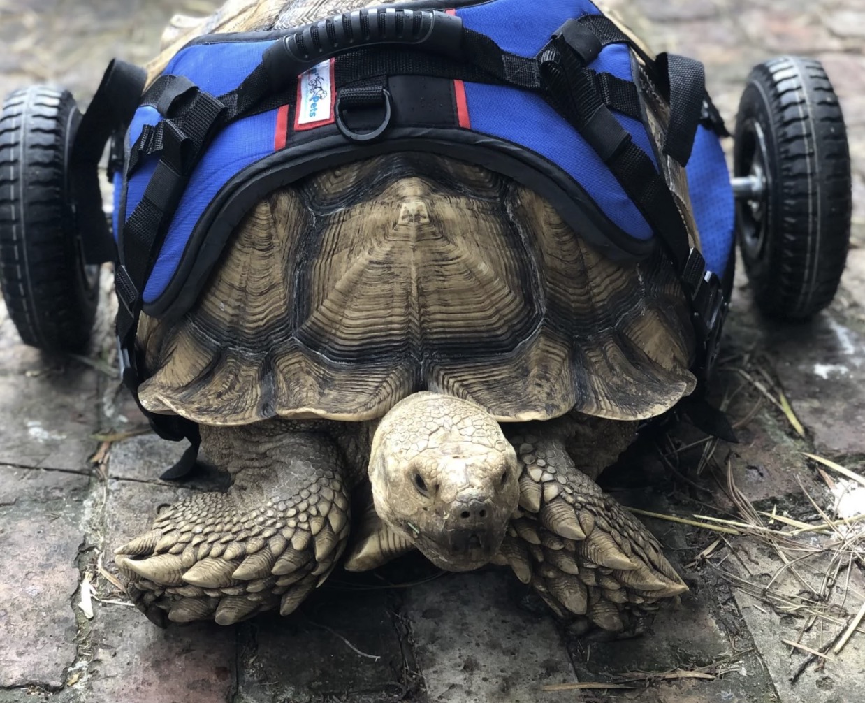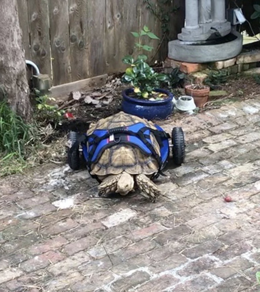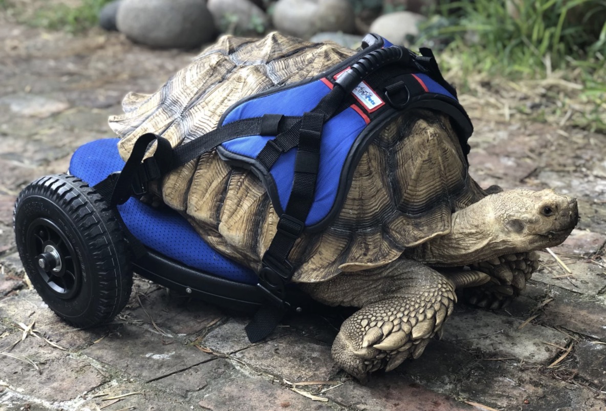 The 11-year-old tortoise recently received a wheelchair from Walkin’ Pets, a pet mobility company based out of New Hampshire, and is walking on all four legs for the first time in his life.