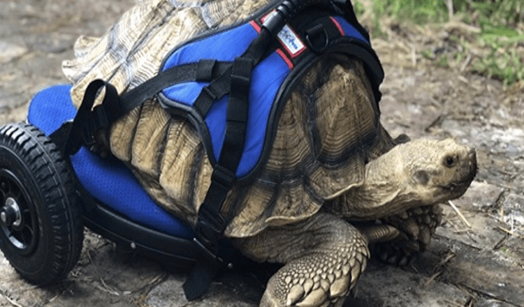 Rescue tortoise George Bailey started moving comfortably with his new wheelchair from Walkin’ Pets right after trying the mobility tool on