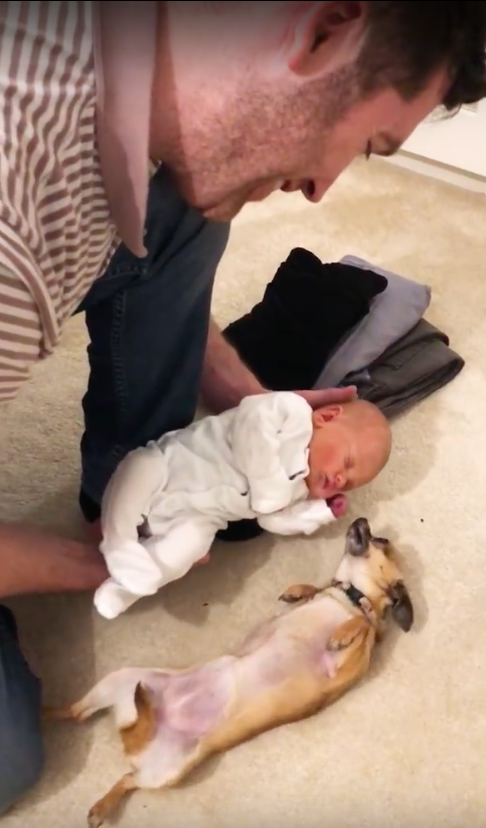 In the video below, you’ll see Eddie lowering four-day-old Nicholas toward Quica, who instantly submitted to him. She rolled right onto her back, showing everyone that Nicholas will be the new boss around here. The couple couldn’t stop smiling at Quica’s reaction. While lying on her back, Quica takes a few good sniffs of Nicholas. It’s obvious that she and Nicholas are going to be best buds.