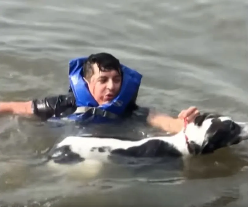 He swam to the frightened dog and tried to grab her but when he did; she quickly turned and bit his face and hand. Ignoring his own blood and pain, he purposefully continued to push the dog until reaching the safety of the shore.