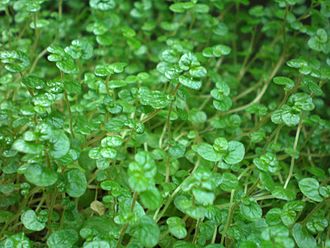 Soleirolia soleirolii (/soʊˌliːəˈroʊliə soʊˌliːəˈroʊliˌaɪ, ˌsoʊlɪˈroʊ-/,[2][3] syn. Helxine soleirolii) is a plant in the nettle family. It has a number of common names, including baby’s tears, angel’s tears, peace in the home, bits and pieces, bread and cheese, Corsican creeper, Corsican curse, friendship plant, mind-your-own-business, mother of thousands, Paddy’s wig, and pollyanna vine.[4] It has also been called Irish moss; however, it is not a moss, nor should it be confused with Sagina subulata or Chondrus crispus (an alga), which are also known as “Irish moss”.