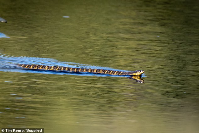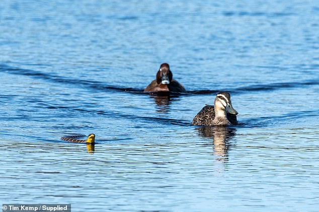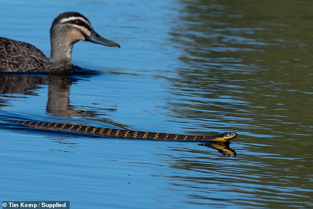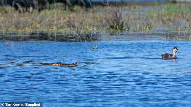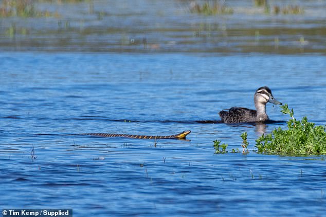 Tim Kemp spotted the snake approaching floating vegetation where the ducks were sitting and prepared to see one of the ducks become the snake’s next meal.