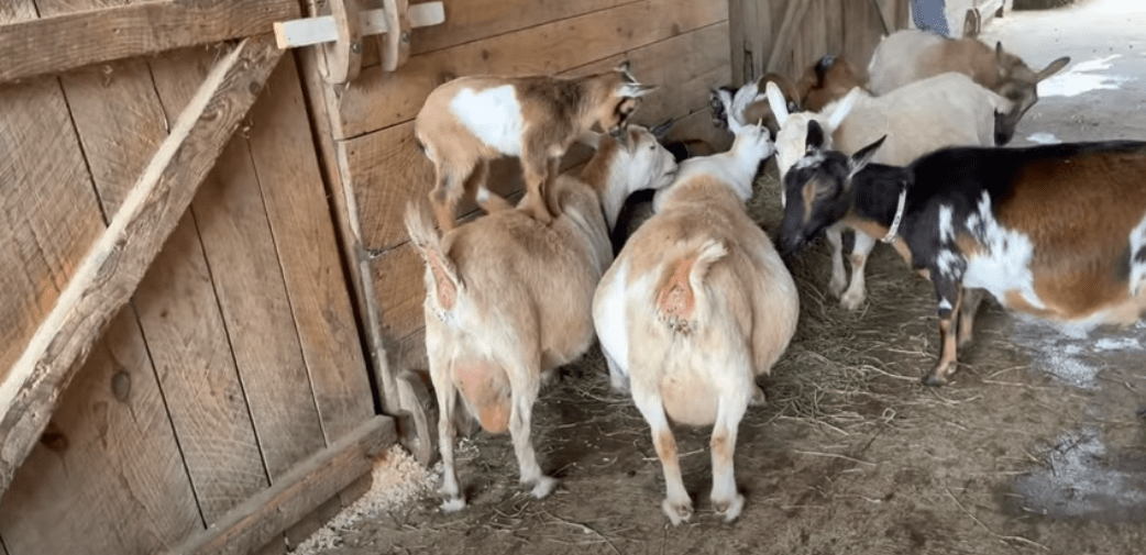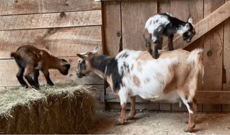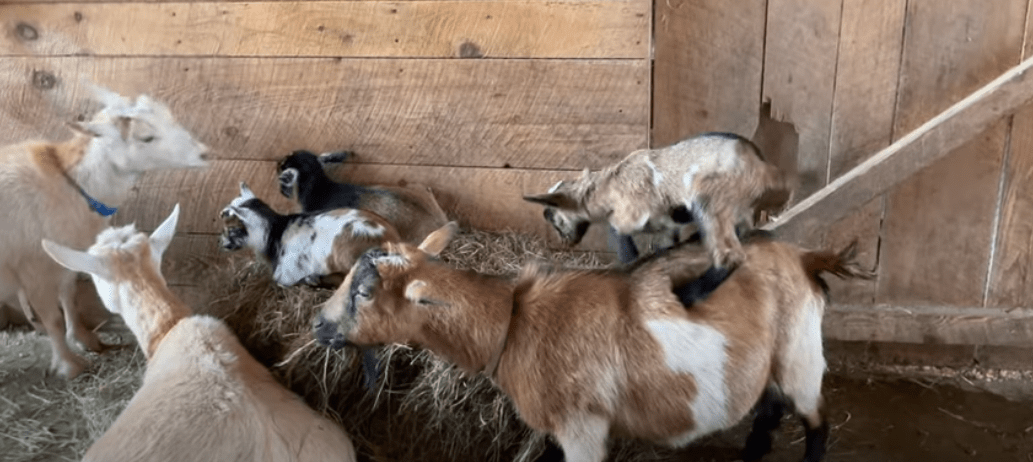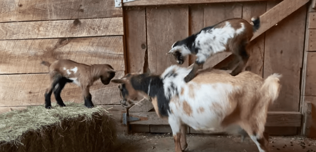 But these baby goat kids are riding their mom’s back effortlessly. They have an outstanding balance while the mommy goat is moving around the farm.