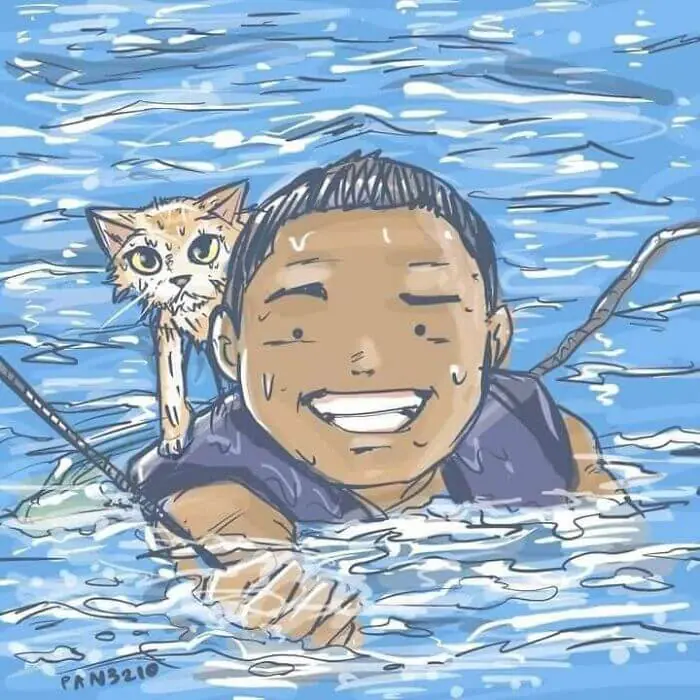 As the fires were spreading out, there had not been much time left prior to the boat sank totally. He swam with the cats, one at a time, on his shoulders backward and forward between 2 watercrafts.