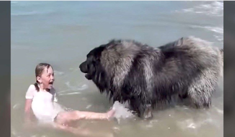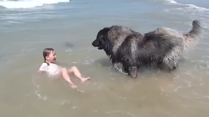 While the little girl and big dog are frolicking in the water, the pup looks on as she splashes around. Everything is fine, and he’s standing in as her lifeguard, when all of a sudden, a wave comes in. It’s not a big wave, but it’s enough to catch her off guard and knock her down for a few seconds. She’s ok, still laughing, but the dog isn’t having it. With her safety in mind, the big fluff ball decides he’s had enough and grabs her by the tuft of her t-shirt. Then, he slowly, but carefully, drags her out of the water. The girl is in hysterics laughing, but her friend isn’t very pleased. He doesn’t want to stick around to see what could happen next if another wave was to come up again. No sir. He wants to make sure she’s safe and sound. Now, that’s a good friend!