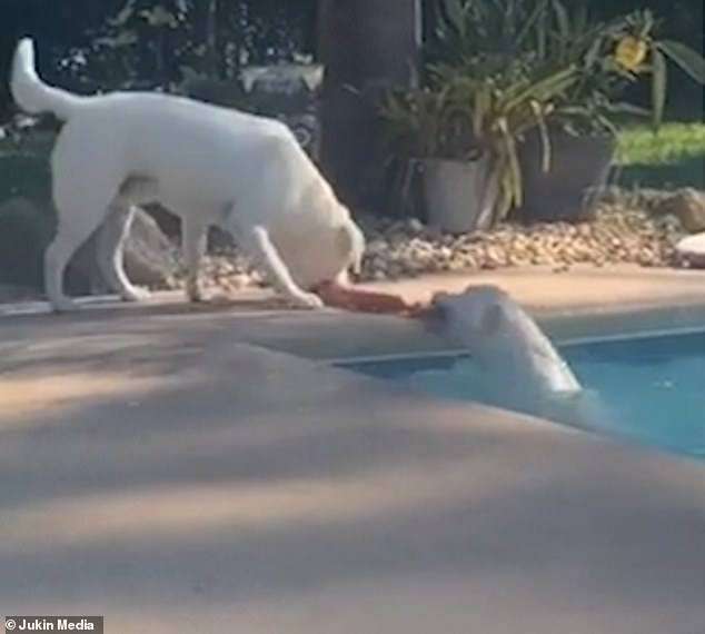 Footage captured by retired firefighter paramedic Aaron Tucker from Daytona Beach, Florida, shows his brother’s dog throw the end of a rope chew toy to his sibling as she struggles to pull herself to safety.