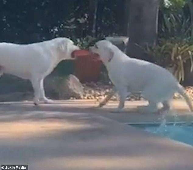 During the clip, which was shared online on September 27, the dogs stand near the edge of the pool before one of them falls in.