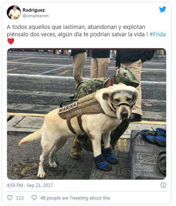 “This is Frida. She belongs to SEMAR and has helped save 52 lives in various natural disasters at national and international levels.”