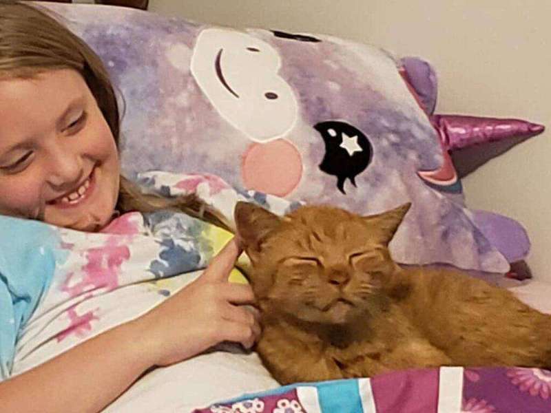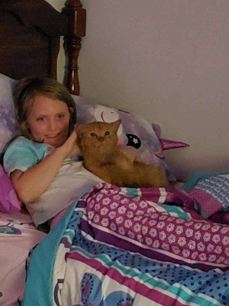 Farrell spotted a large orange cat snuggled up with her daughter under the covers. The little girl had snuck the cat inside while her mom was cooking dinner, and moved a litterbox from the bathroom into her closet, along with some food and water.