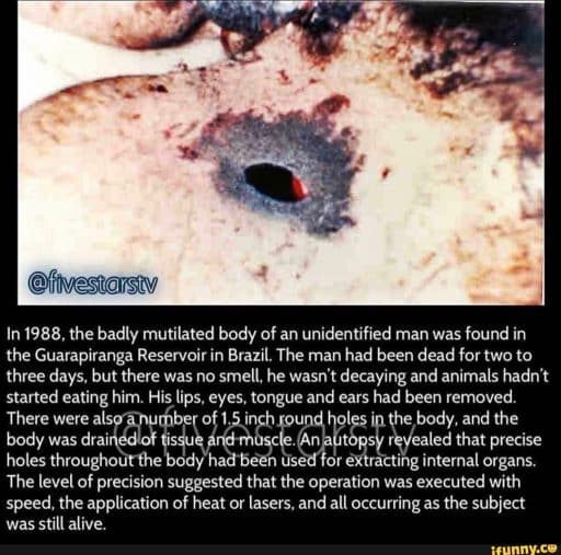 In 1988, the badly mutilated body of an unknown male was discovered in the Guarapiranga Reservoir in Brazil. The man had actually been dead for a couple of days, yet there was no odor, he had not been decomposing and animals had not begun eating him. His lips, eyes, tongue as well as ears had been eliminated. There were a number of 1.5 inch round holes in the body, as well as the body was drained pipes of tissue as well as muscle mass. His genital areas had been mutilated and the rectum had been cored out. The man really did not have any kind of restriction marks on his body, as well as blood loss had actually been very little.