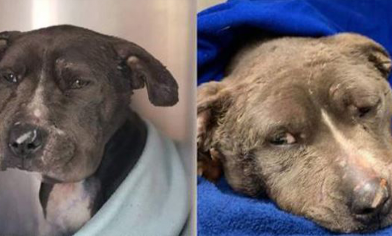 An emaciated three-year-old female dog covered in open wounds was dumped in a container outside a shelter. There were old and new wounds covering her massively swollen head. It was obvious that this innocent dog was used as a bait dog.