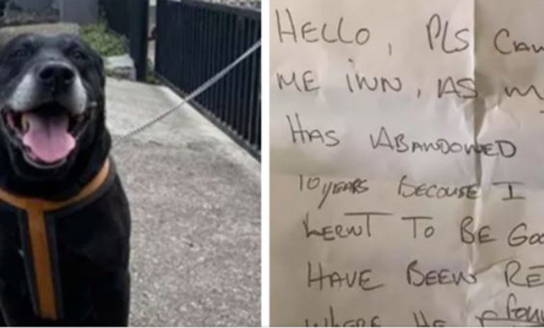 The note stated, “Please can you take me in as my owner has abandoned me after 10 years because I have not learnt to be good so I have been returned here where he found me.”