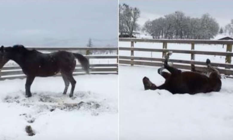 One of these rescued horses who reside at Duchess Sanctuary got to enjoy the first snow of the year in Oregon. In the video below, you can see her rolling around in the snow and wagging her tail like she’s a big dog. She stands up, shakes the snow off, runs around and then gets right back on her side to roll around again. She LOVES it!