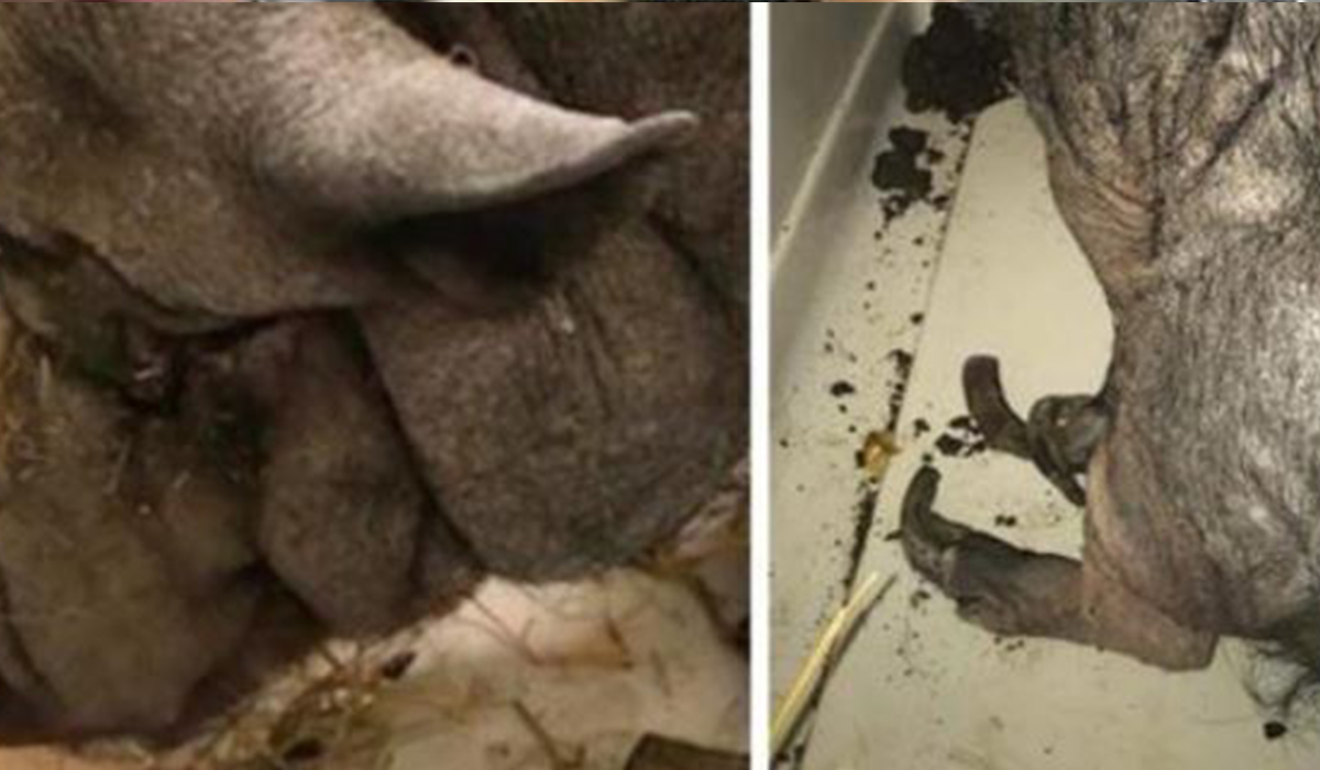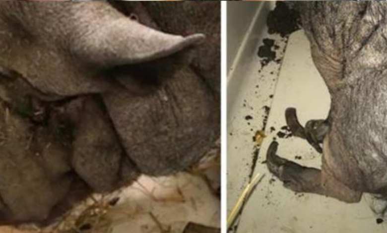 She was found locked inside of a barn. No one had come by to care for her in a very long time. The poor pig’s hooves were so overgrown that she couldn’t take one step without feeling terrible pain.