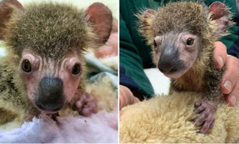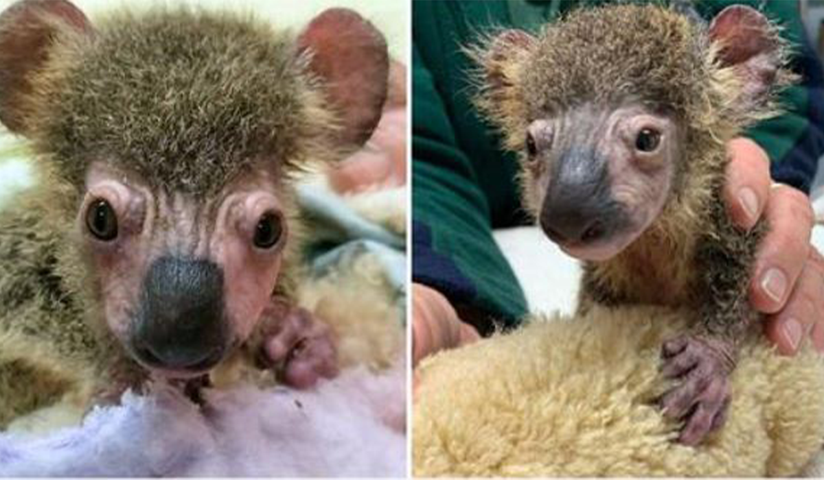 One little Koala was rushed to Koala Hospital Port Macquarie after he was found all alone by a detection dog. The poor joey had an advanced fungal infection, which left him without most of the hair on his tiny face.
