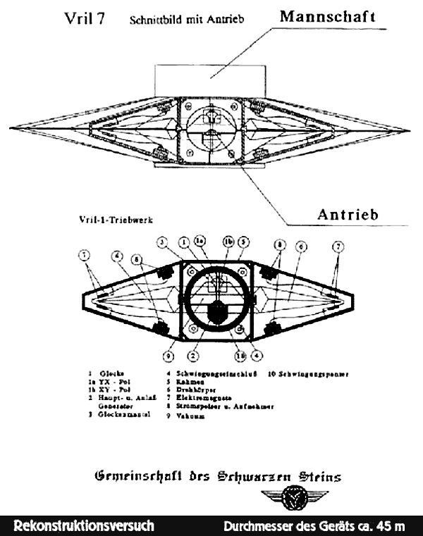 Obviously, this project was reviewed once more on January 22, 1944, in a meeting between Hitler, Himmler, Dr W. Schumann (researcher and also professor at the Technical College of Munich) and Kunkel of the Vril Culture. It was determined that a model Vril 7 “Jäger” (seeker in German) would certainly be sent through a supposed dimensional network outside the rate of light in the direction of Aldebaran.