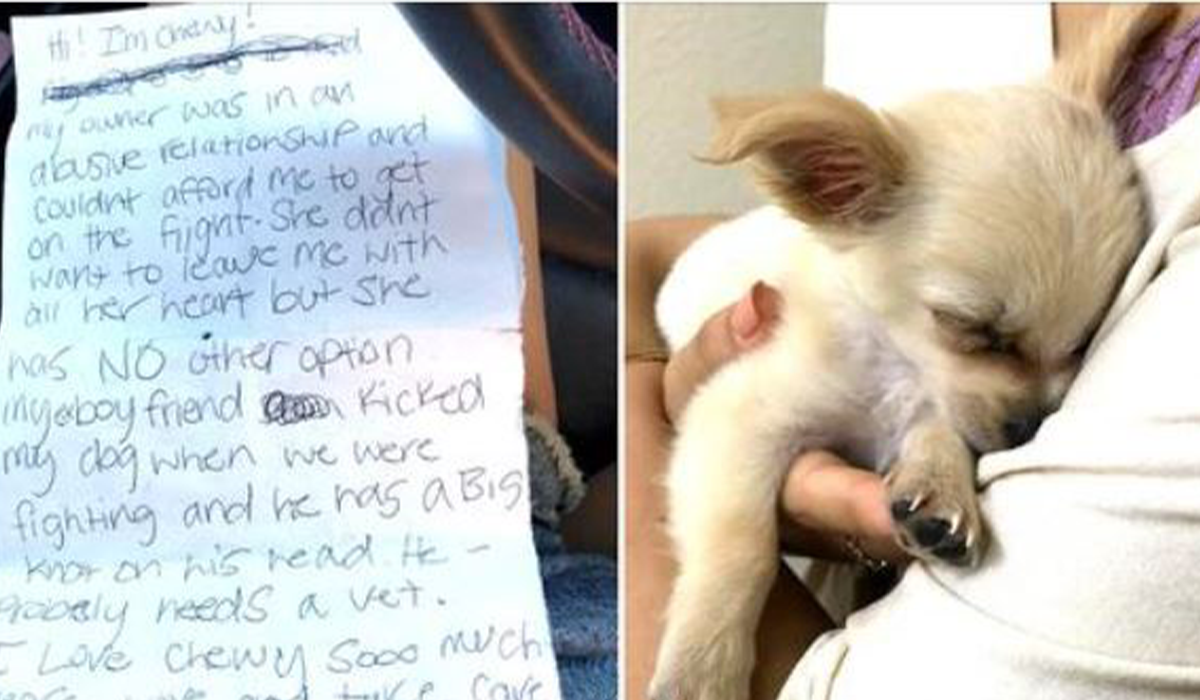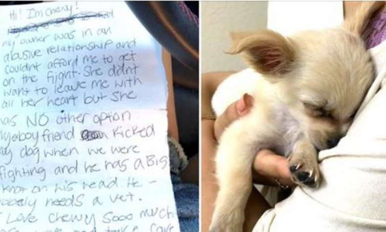 Chewy is a 3-month-old Miniature Chihuahua, whose mom was in the Las Vegas’ McCarran International Airport, escaping from her abusive boyfriend. Unfortunately, she couldn’t afford to get Chewy on the flight, and as per her note, leaving him in the bathroom was her only option.