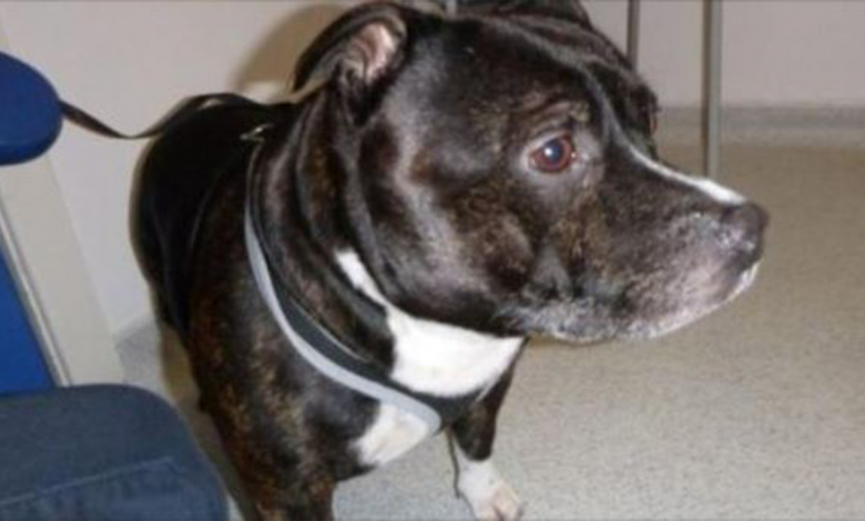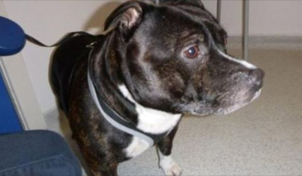 The dog, now renamed Cracker, is a brindle and white Staffordshire bull terrier-cross.