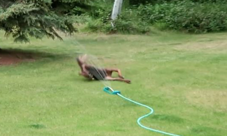 Baby moose caught playing in sprinkler in family’s backyard