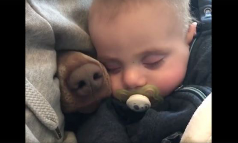Mom’s filming the baby taking a nap when a nose pokes through beside him