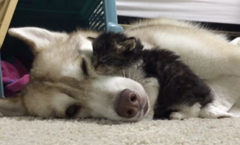The first night residence for Rosie the rescue kitten really did not go so well. She was frightened as well as shy, but then they introduced her to their Siberian Husky. This is when everything changed …