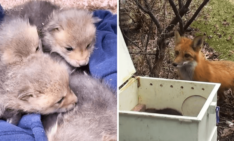 The vixen digs the dirt nervously as she assesses the circumstance. When she sees the box, she fears initially. Ultimately, she begins grabbing the dogs from the container individually.