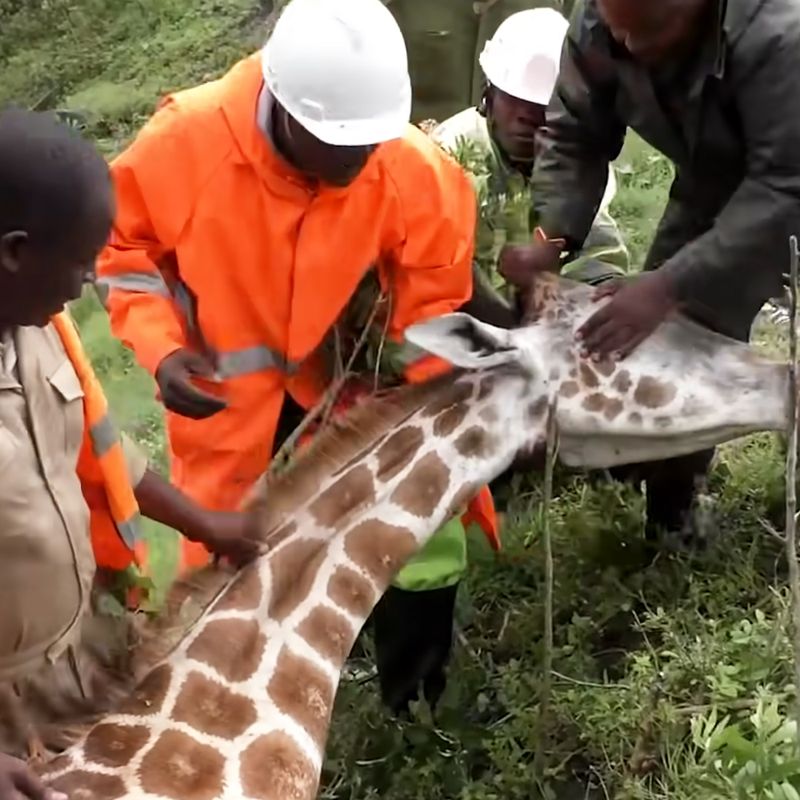 Giraffe with tire stuck around her neck helped by kindhearted veterinarians