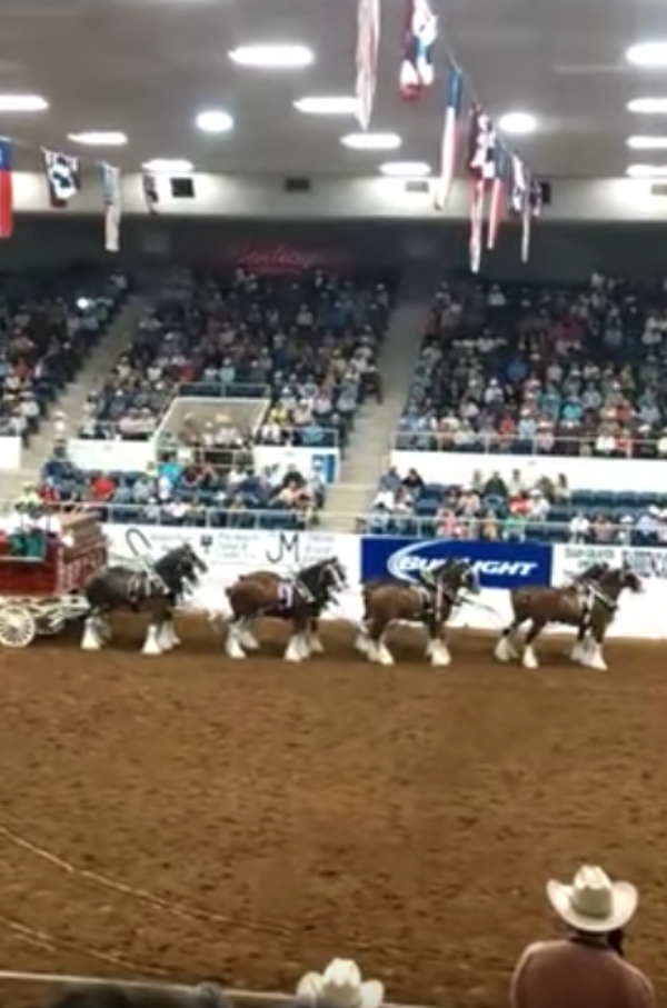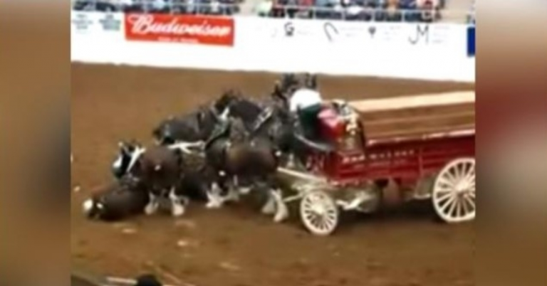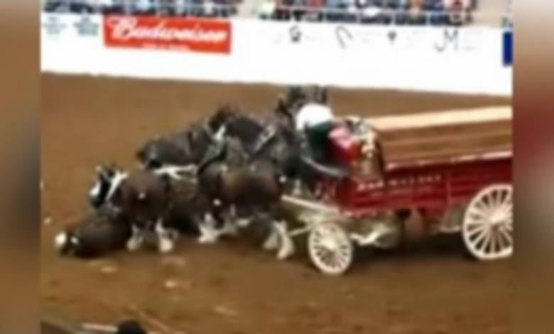 When the Clydesdales performed in front of a packed audience at an indoor arena, the crowd was filled with anticipatory excitement. One man in the audience captured a very scary moment when the horses collapsed in unison.