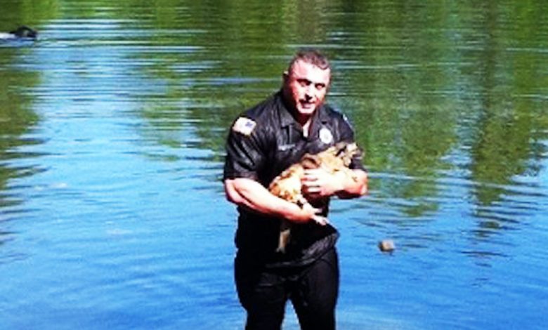 She called the authorities for help, and they directly arrived. David Harriman, a police officer, knew that he had to act immediately and jumped into the water to save the dog!