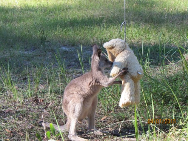 The photo was taken on the property of Doodlebugs wildlife caretaker in New South Wales, she found that orphaned animals responded well to teddy bears.