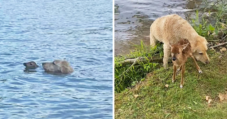 The pet dog had realized that he was not alone as he saw a baby deer fighting to get back to the shore of the lake. The brave dog had jumped into the water to save the little fawn.