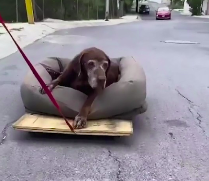 The family came out and, in tears, hugged him and told him how much they loved and would miss him as she carried him for one more walk on a small bed perched on top of a board.
