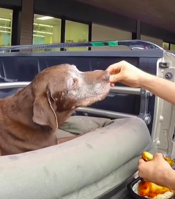He drove about with the dog in the back of the truck as a group of people brought him his final meal of chicken and cookies. Cappuccino chowed down on his dinner.
