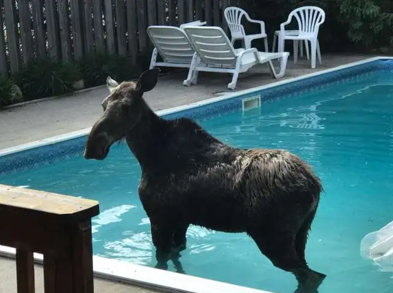 Although the pool suffered a little damage from two hoof-sized holes at the bottom, the moose was uninjured.