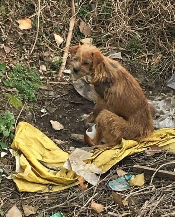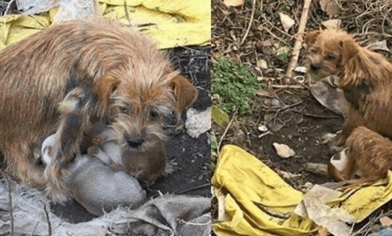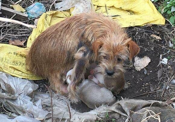 When the dog finished eating and he left, the dog barked loudly and ran in front of him. She ran to the side, looking back as if she wanted him to follow her. Out of curiosity, he followed it, which was a garbage dump not far away, and the dog quickly ran back to a patch of grass where 2 puppies had not yet opened their eyes.