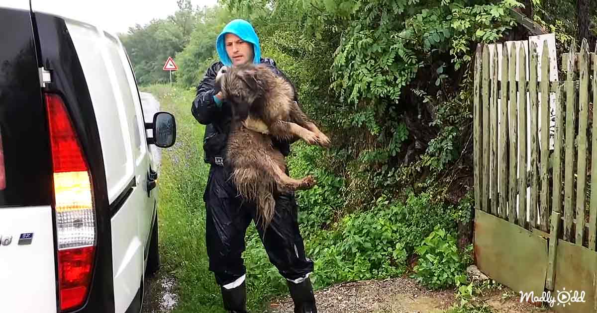 As shelter volunteers were traveling back to the Dog Rescue Shelter in Mladenovac, Serbia, they saw a stranded dog on the side of the road. The dog was alone and standing in the cold rain.