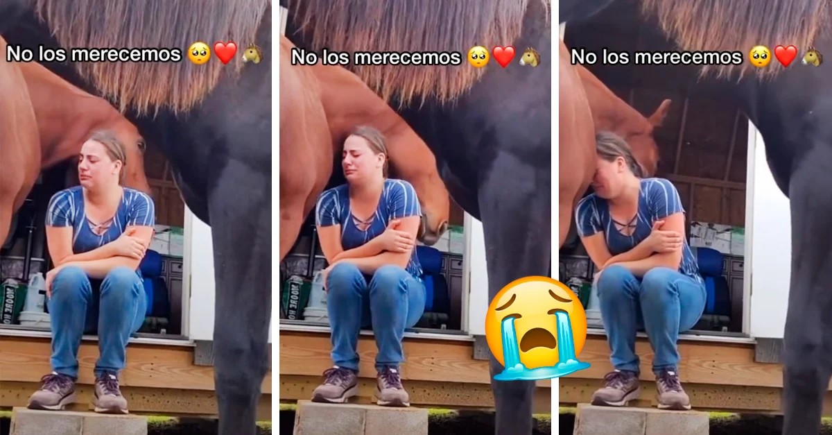 The video was posted on TikTok under the caption “We don’t deserve them”, and it shows how the horse Shiner realized that Shania was crying, and little by little he pushed her towards his body and placed his head on her back; it seemed that he was giving her a hug to comfort her and try to calm her down.