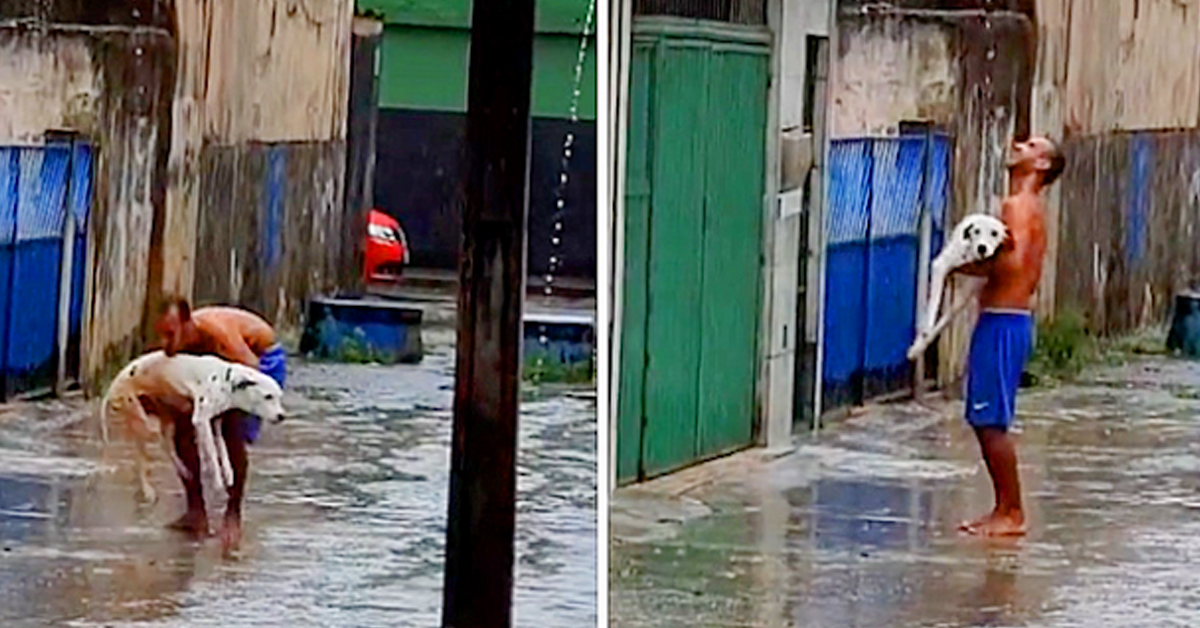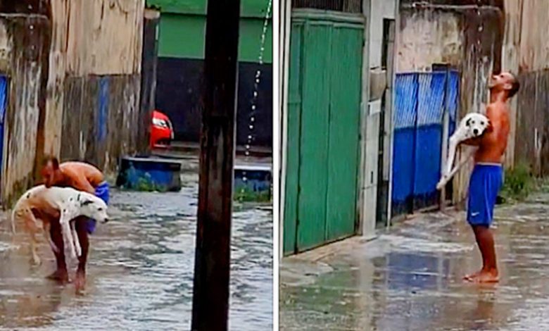 Man Holds His Paraplegic Dog In His Arms To Enjoy The Rain