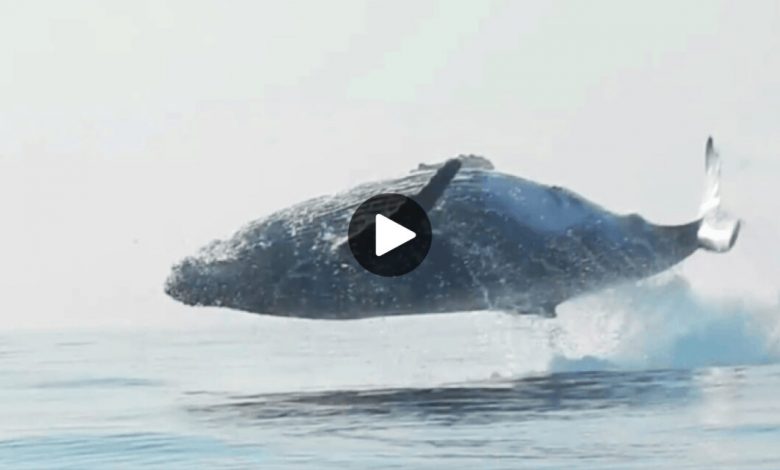 Rare footage shows 40 ton humpback whale leaping entirely out of the water